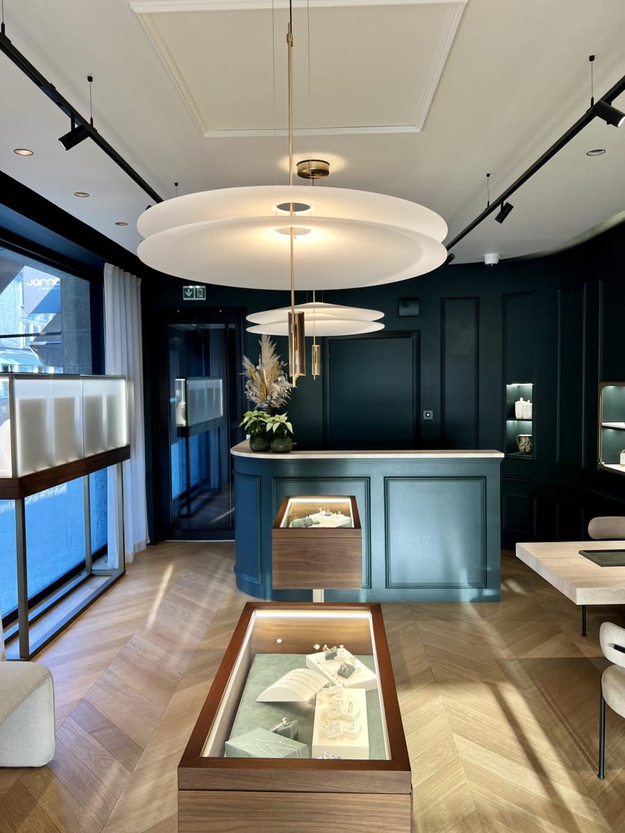 Transformation d’un immeuble bancaire en une bijouterie haut-de-gamme et ses ateliers, pour la maison Jarnage. Agencements intérieurs sur-mesure répondant aux besoins et usages spécifiques du joaillier et de sa clientèle.